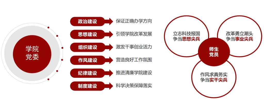 学院党委确立了“把方向・疏梗阻・聚同心・赋新能・育尖兵”的15字党建工作方针,突出“政治引领锚定方向、问题破解打通堵点、价值凝聚筑牢根基、创新驱动激活动能、人才培育彰显使命”。立足“新·生”党建品牌根基,创建融合时代特征与学科特色的“新工科尖兵”品牌,构建“六结合三争当”党建工作体系,推动党建与中心工作深融互促,培养符合时代发展的新工科人才,以高质量党建引领学院高质量发展。