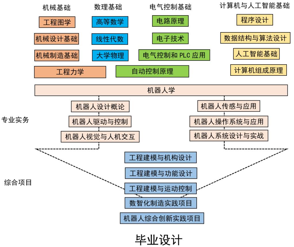 程序设计、机器人设计概论、工程力学、工程图学、电路原理、机器人系统设计与实战、机器人操作系统应用、机器人驱动与控制技术、机器人传感与应用、自动控制原理、人工智能基础、工程建模与机构设计、工程建模与功能设计、工程建模与运动控制、数智化制造实践项目、机器人综合创新实践项目。