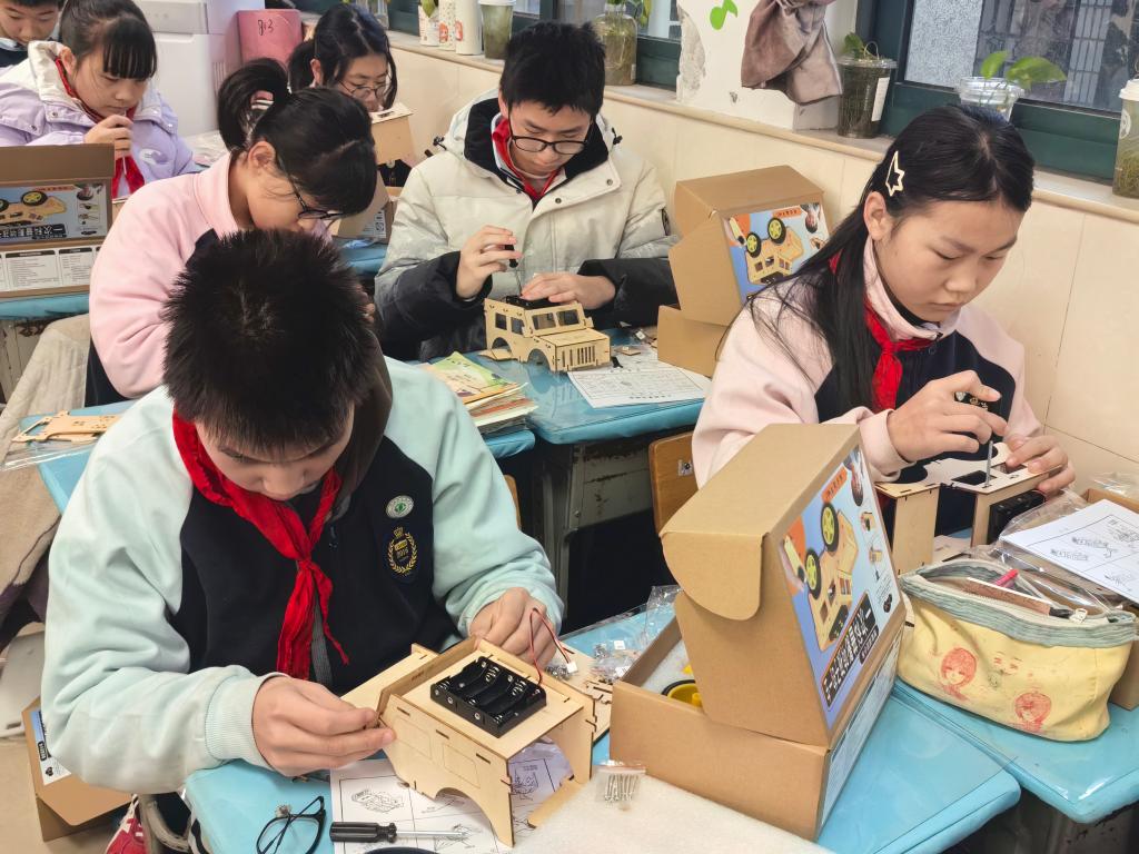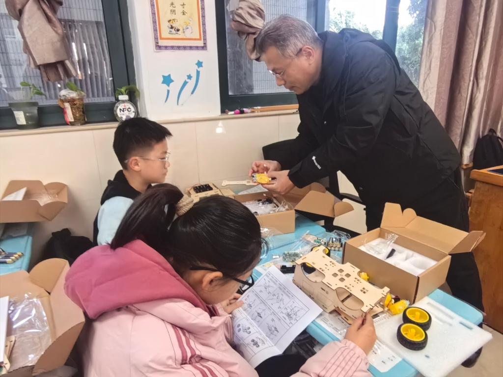 理论学习后,同学们在志愿者指导下分组实操,专注完成零件领取、拼接组装、程序调试等环节,遇问题时主动请教、互助协作。当机器人小车顺利启动,大家操控着小车穿梭追逐,课堂上满是欢呼与笑声。这种“理论+实操”模式,让同学们既掌握机器人基础技能,又锤炼了逻辑思维与动手能力。