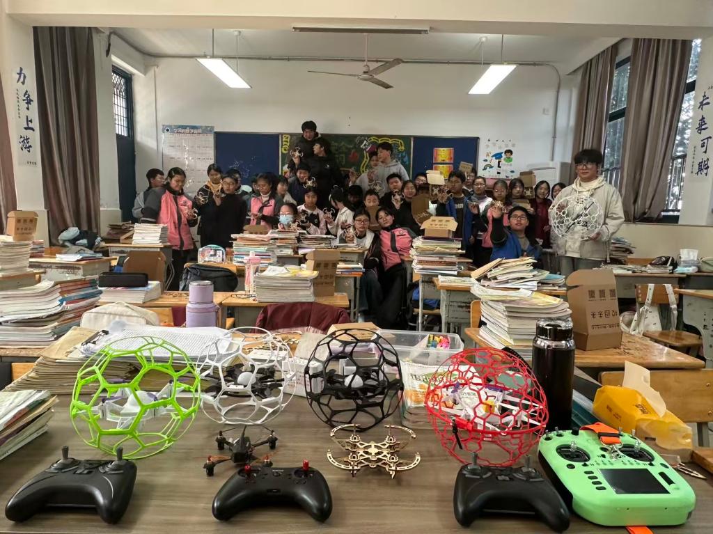 经过一番精心组装,一架架完整的无人机顺利成型。活动场地转移到宽阔的操场后,同学们手持遥控器,操控着无人机缓缓升空。在蓝天的映衬下,无人机自由盘旋、灵活穿梭,同学们通过“云端视角”俯瞰校园,亲身感受航空科技的独特魅力。此次实践不仅让同学们了解了无人机的基本构造与飞行原理,更培养了他们的空间感知能力与专注力,进一步激发了对航空航天领域的探索兴趣。