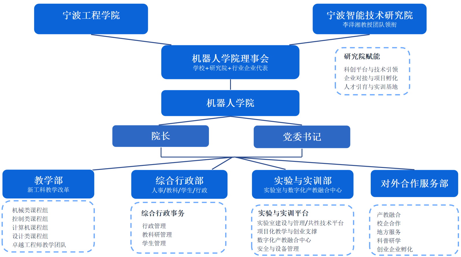 机器人学院由宁波工程学院和李泽湘教授团队领衔的宁波智能技术研究院共建,属于宁波工程学院的二级学院,也是学校重点打造的特色学院,实行理事会领导下的院长负责制,具有独立的管理体系和运行机制。